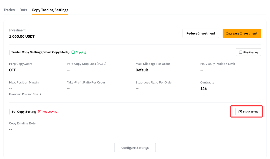 Step 3: Go to the Copy Trading Classic Settings page and you will be able to see the Copy Settings for USDT Perpetual Trades and Trading Bots.