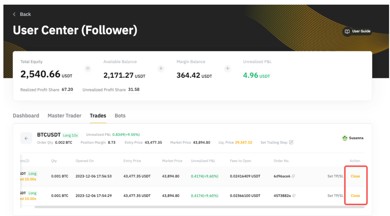 To close an order manually, go to User Center (Follower) → Trades → Open Position → Details. You will see the order placed for that position and you can click on Close to close the respective order. The order will be exited via a Market Order.