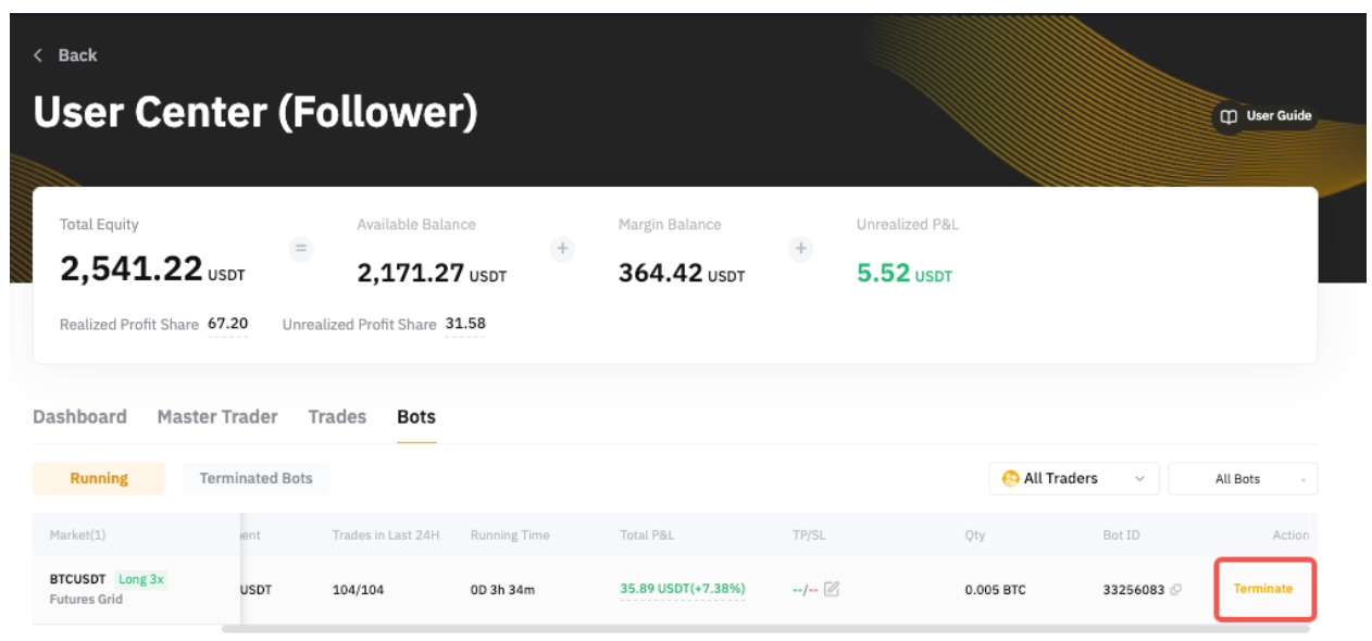 To manually terminate your bot, go to User Center (Follower) → Bots → Running and click on Terminate. When you terminate your Futures Grid Bot, all your pending orders within the bot will be canceled and your positions will be closed at the current market price.