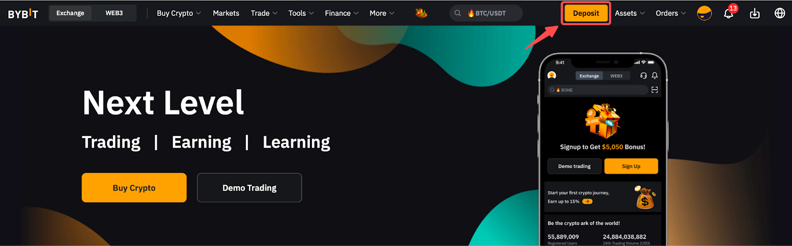 Вход в раздел с депозитами также можно найти в правом верхнем углу на странице Bybit.