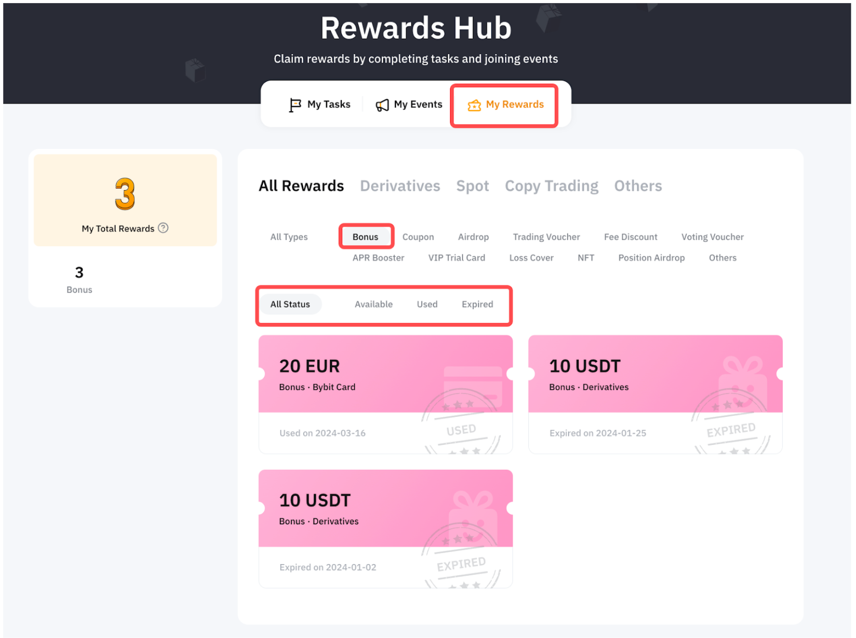Крок 3. Щоб переглянути деталі отримання винагород, перейдіть до розділу Мої винагороди та виберіть Бонус, щоб переглянути всі отримані бонуси.