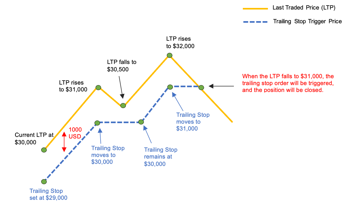Припустимо, що трейдер A відкриває довгу позицію в BTCUSD на 30 000 USD та встановлює ордер Трейлінг-стоп з корекцією за відстанню 1000 USD.