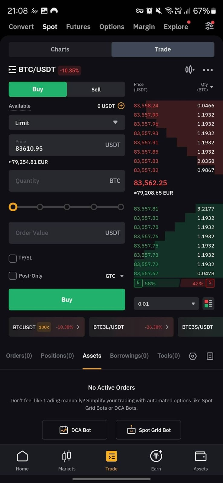 在 Bybit App 上,前往 Trade,開啟 Spot Trading 頁面,然後點選 Trade。點選位置標籤區段右上角的訂單記錄圖示,以檢視您的訂單記錄和交易記錄。