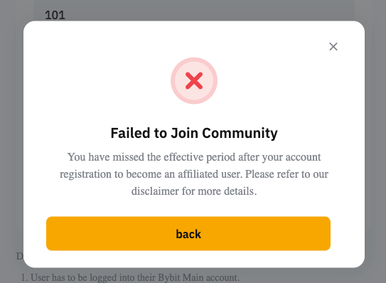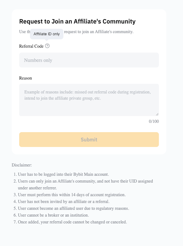 用戶在報名期間可能會因各種原因而錯過新增代理商或 KOL 邀請碼。 因此,Bybit 現支援用戶在註冊加入代理商社群後的 14 天內手動新增邀請碼。