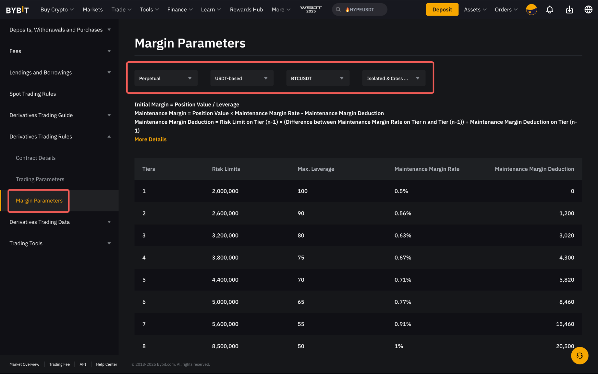 要查看所有交易對的風險限額資訊,請依次點擊合約資訊 → 衍生品交易規則保證金參數或訪問此頁面
